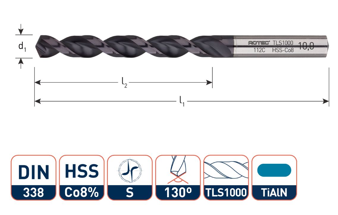 - The TLS1000 spiral ensures very good chip removal at greater drilling depths (>5xD in one go without unloading is possible), top angle 130°