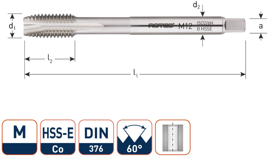 - HSS-Co machine tap DIN 376, metric [M], 60°, thin shank, type B with peeling cut (up to M16) or long cut (>M16)
