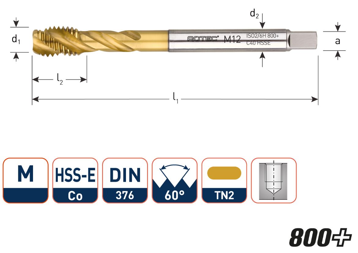 - HSS-E machine tap DIN 371, metric [M], 60°, ISO2 (6H), thickened shank, type C with helix angle 40°, TN2 coated (TiAlN TiN) for higher cutting speeds and longer tool life