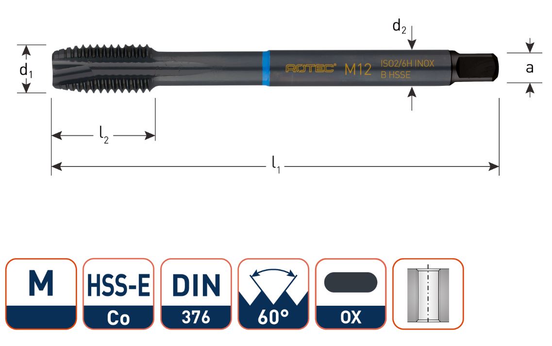 - High-performance HSS-Co thin-kerf machine tap DIN 376, metric [M], 60°, ISO2 (6H), thin shank, type B with peeling cut
