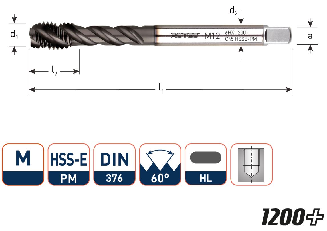 - HSS-E PM Machine stud DIN 376, metric [M], 60°, 6HX, thin shank, type C with helix angle 45°