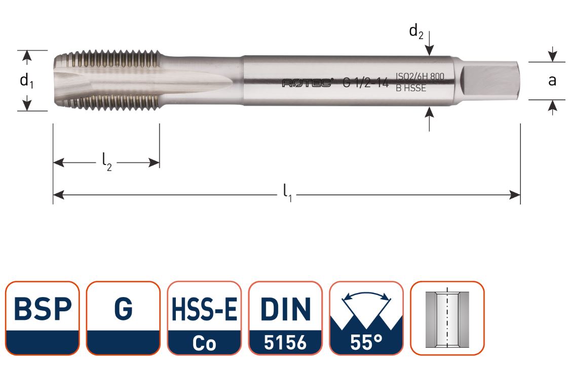 - HSS-Co machine tap DIN 5156, BSP (G, gas thread), 55°, ISO2 (6H), type B with peel off cut
