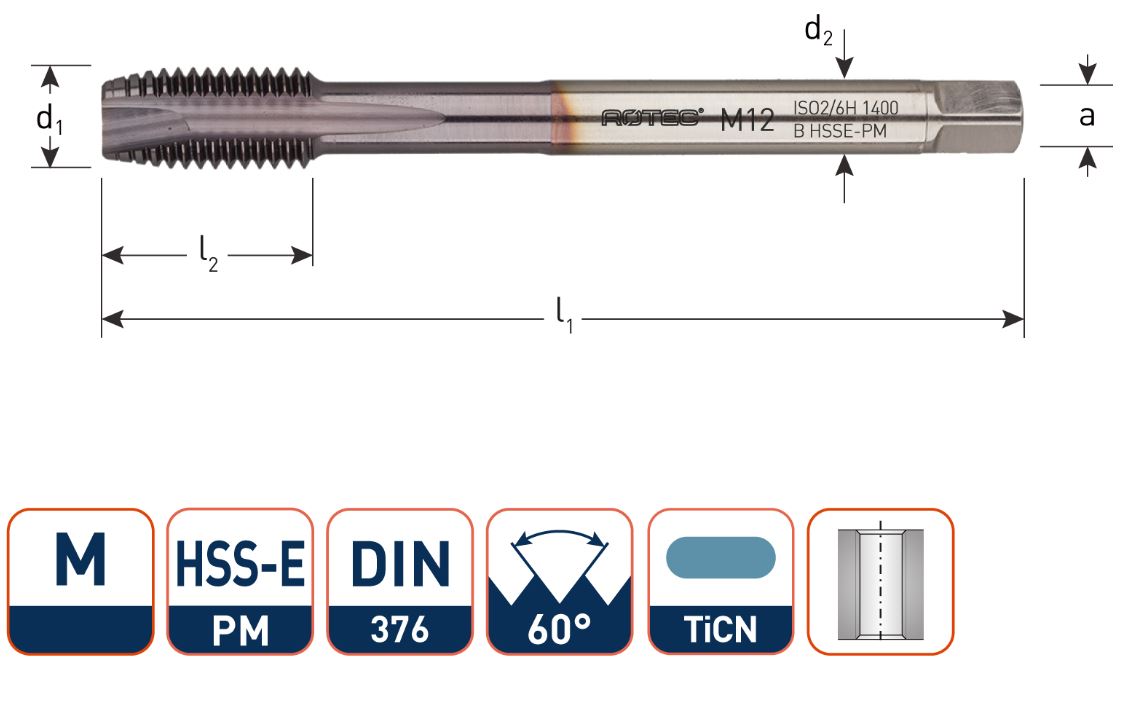 - High-performance HSS-E-PM (powder metallurgy) red ring machine tap DIN 376, metric [M], 60°, ISO2 (6H), thin shank, type C with peeling cut, TiCN coating for longer tool life and higher cutting conditions