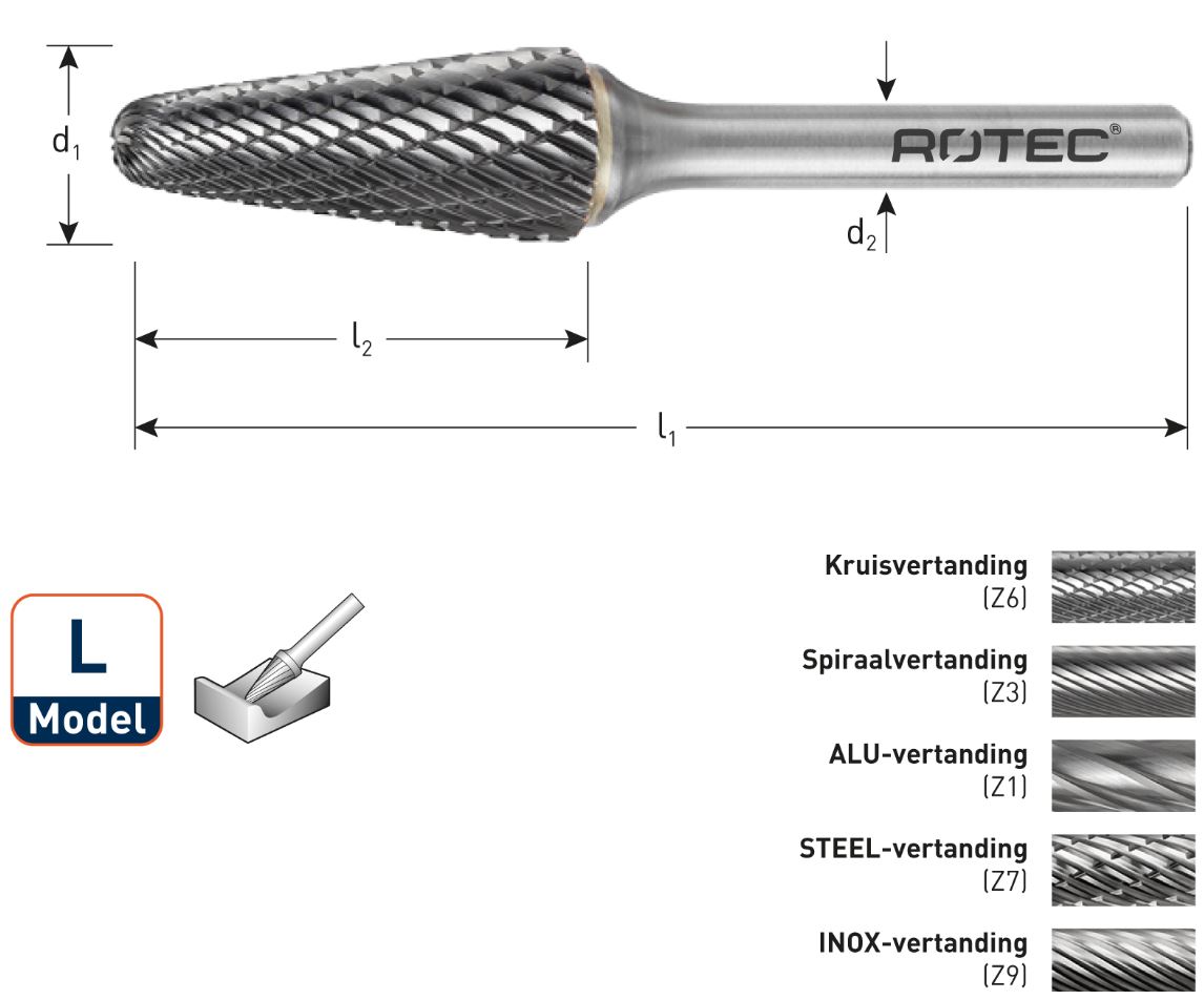 - Tungsten carbide burr in conical shape with round head, in various cuts
